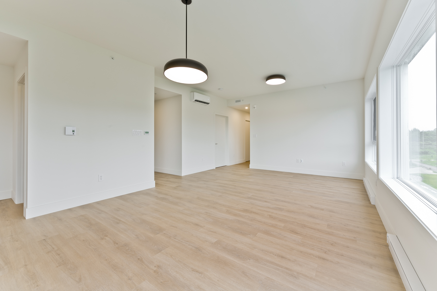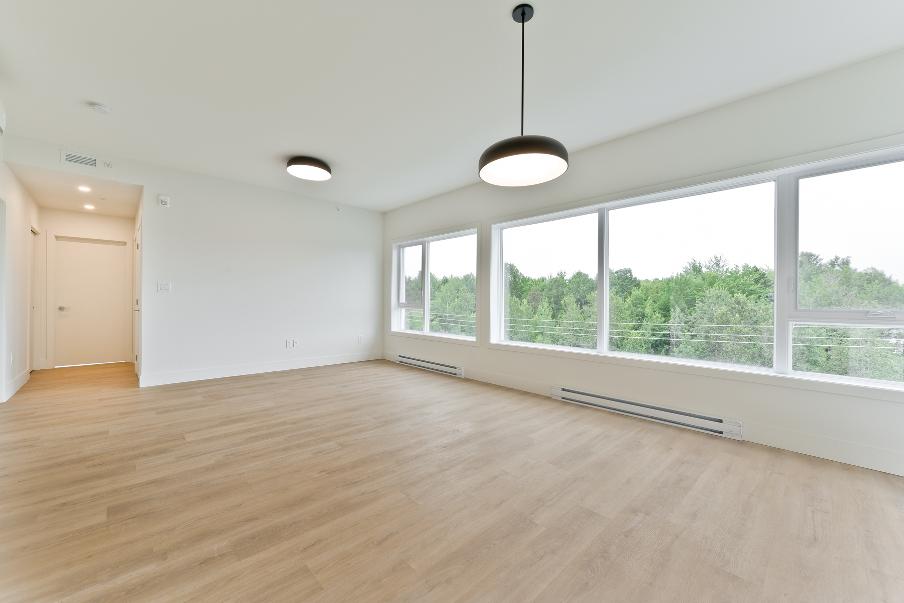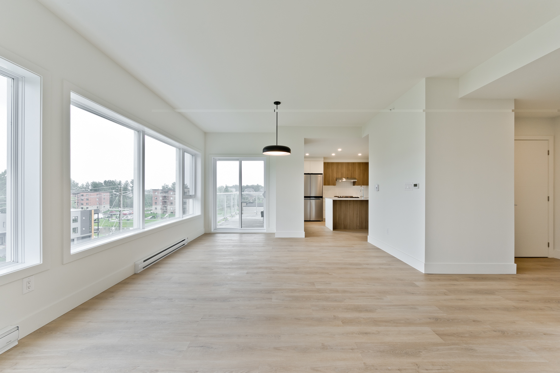 • Cuisine, salon et salle à manger à aire ouverte meublé avec fenestration surdimensionnée, incluant l’habillage des fenêtres.