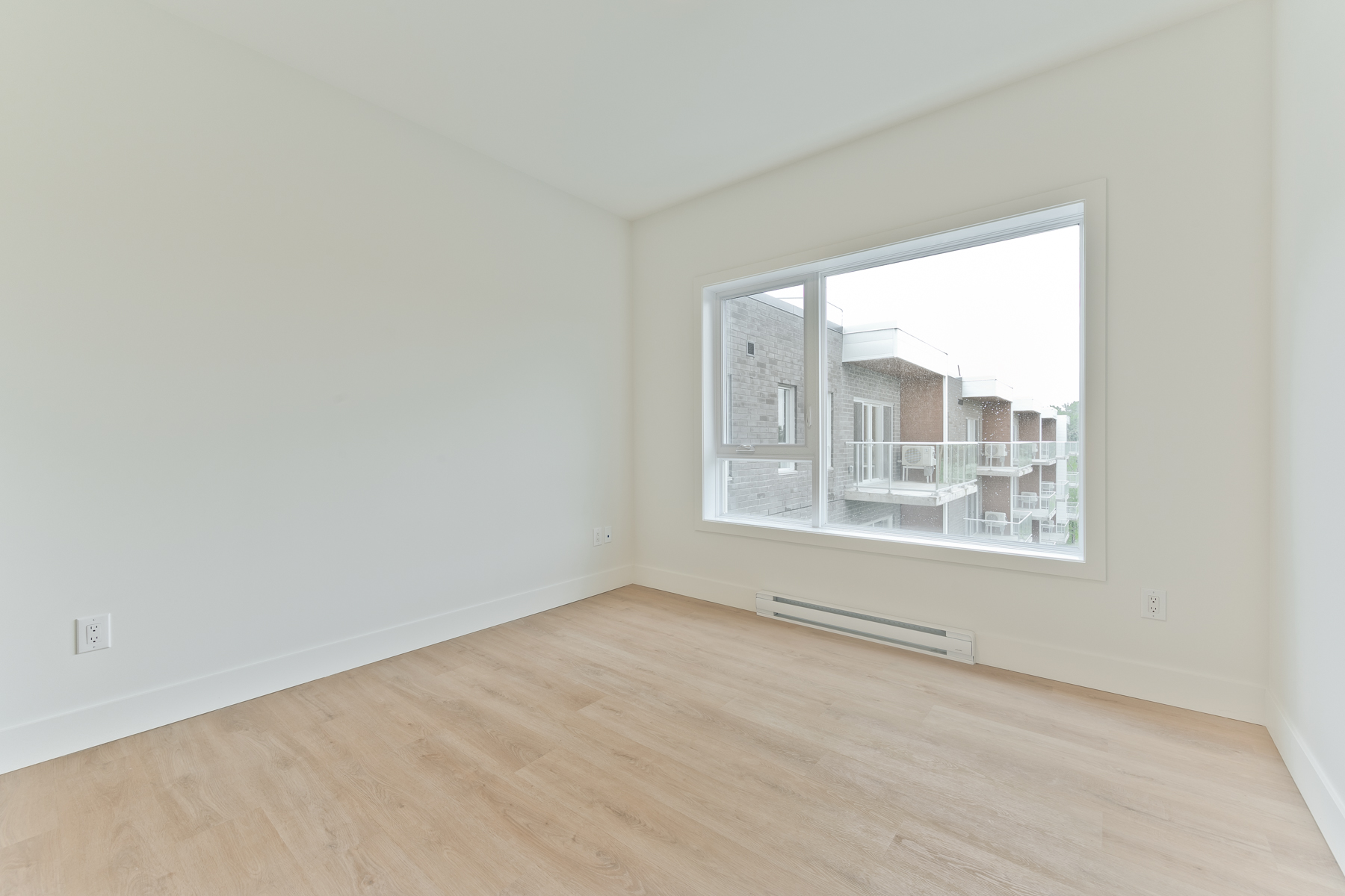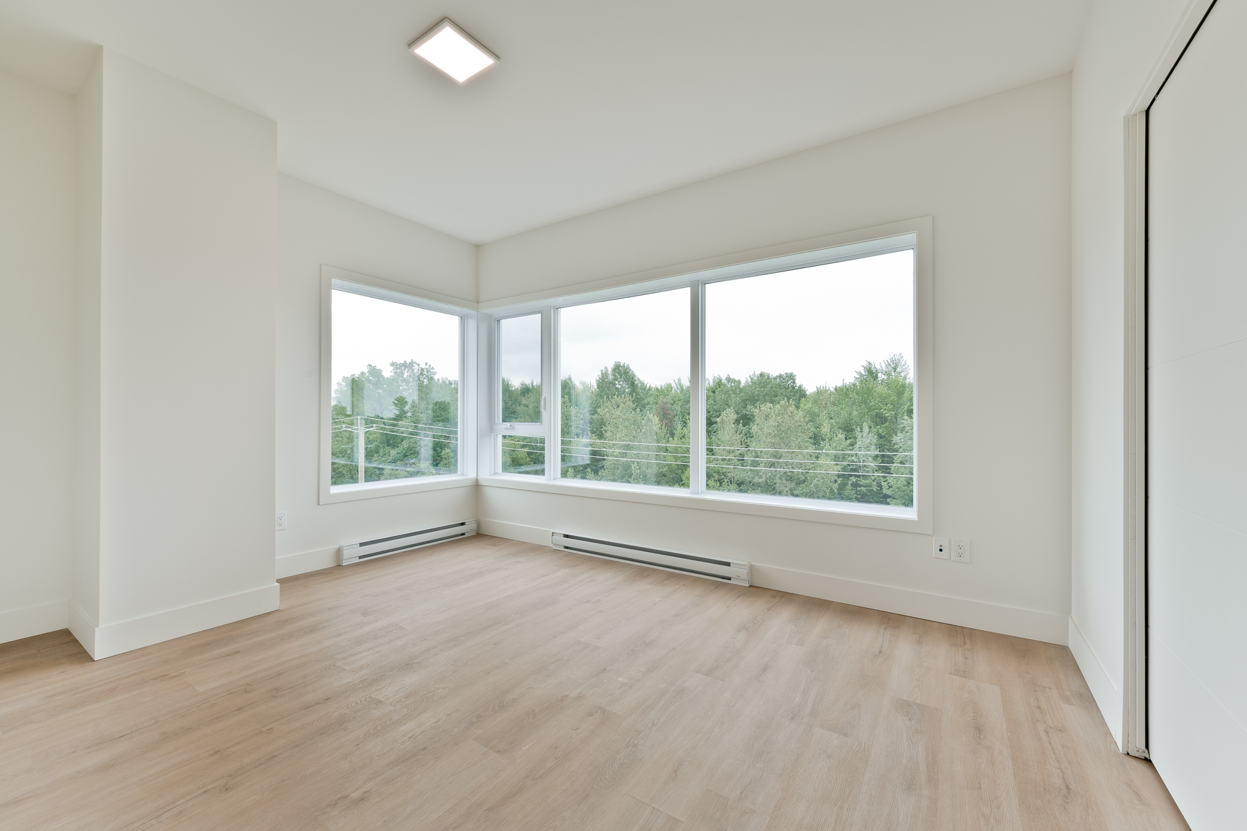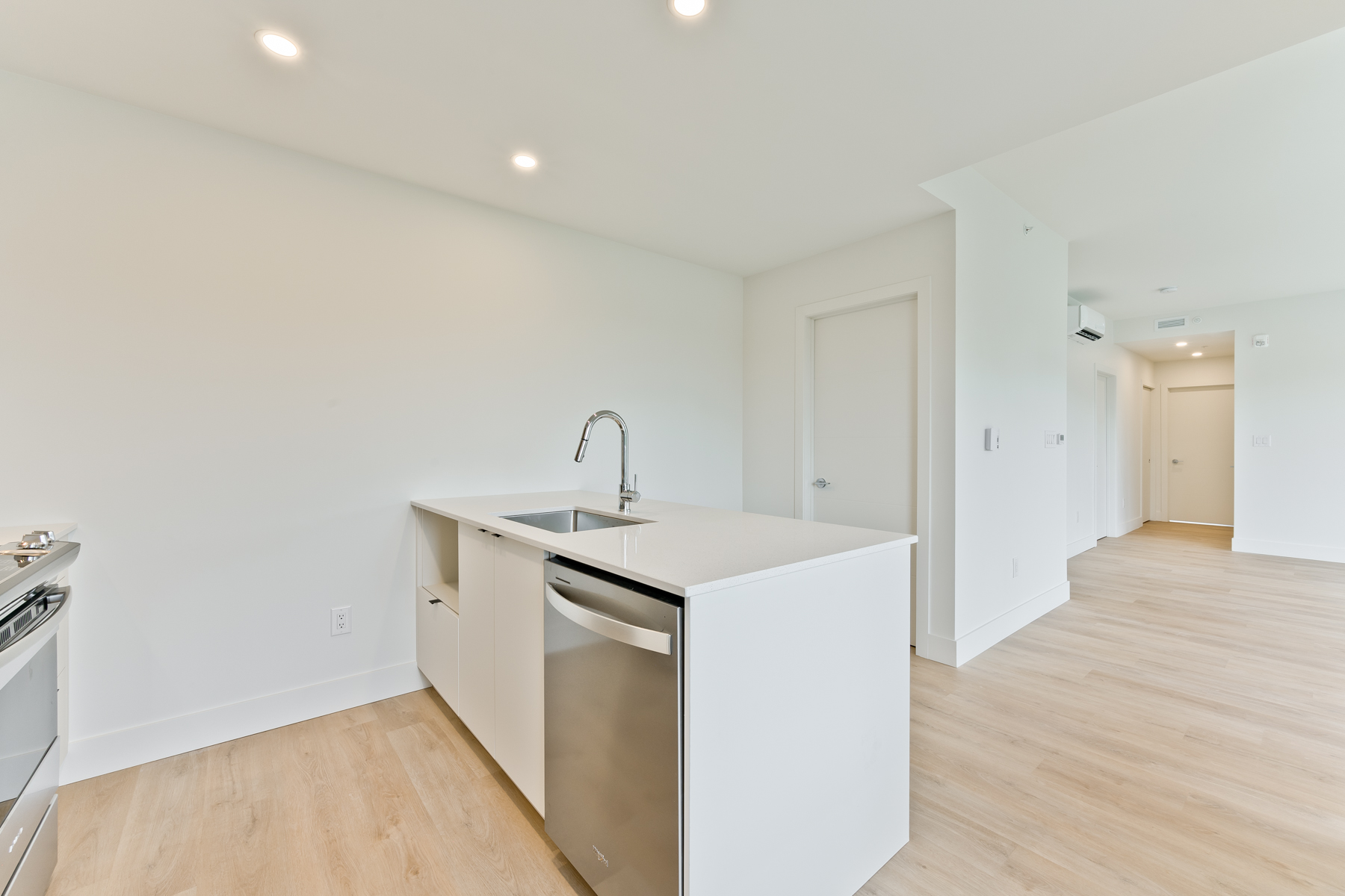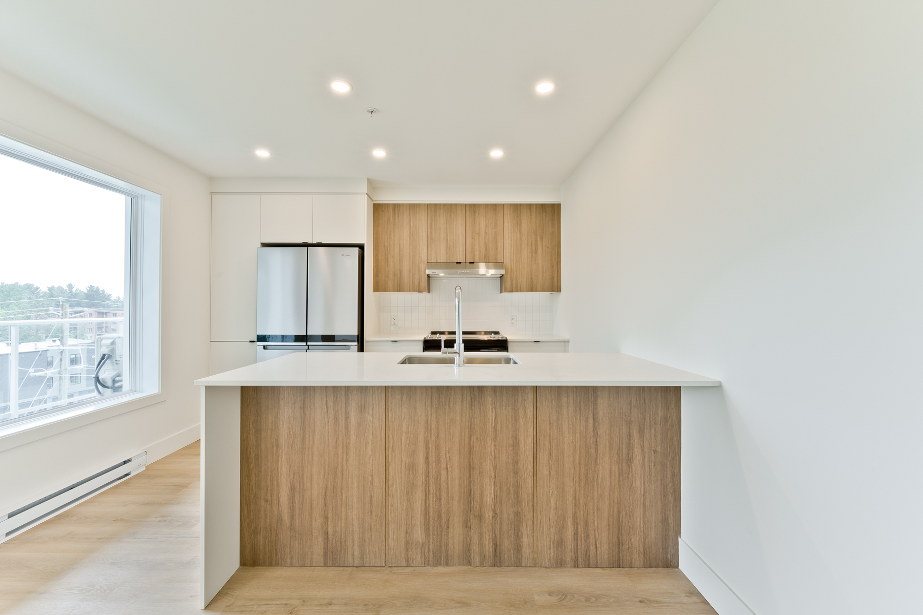 • Cuisine, salon et salle à manger à aire ouverte meublé avec fenestration surdimensionnée, incluant l’habillage des fenêtres.